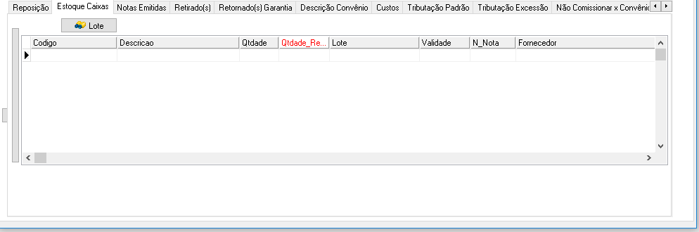- Campo de Visualização da Pesquisa: Código, Descricao, Qtdade, Qtidade_Restante, Lote, Validade, N_Nota, Fornecedor, Localizacao, Id_Cirurgia, Id_Avulsa, Id_Consignado, Id_Caixa, Id.