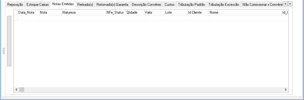 - Campo de Visualização: Através dessa área é possível visualizar todas as notas que foram emitidas para o produto específico detalhando: Data_Nota, Nota, Natureza, Nfe_Status, Qtidade, Valor, Lote, IdCliente, Nome, Id_Cirurgia, Id_Avulsa, Id_Consignado, Id_Emprestimo.