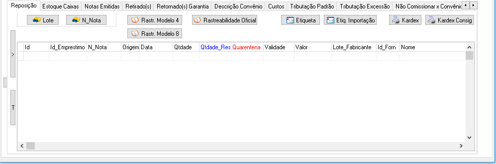 - Campo de visualização das pesquisas: Nesta área é possível visualizar detalhes do histórico do pRoduto como: Id, Id_Emprestimo, N_Nota, Origem, Data, Qtdade, Qtdade_Restante, Quarentena, Validade Loc_Estoque, Lote_Fabricante, Id_From, Nome, Obs.