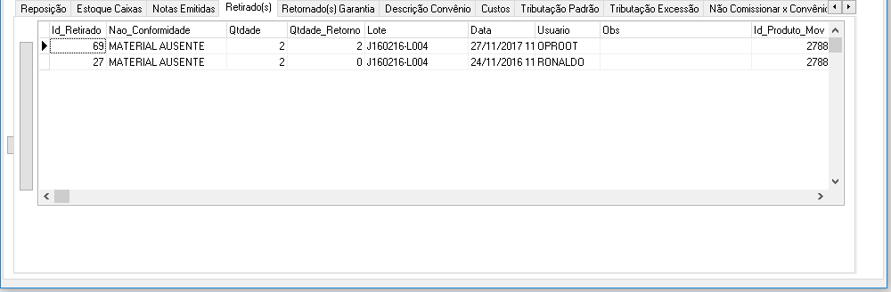 - Campo de Visualização: Id_Retirado, Nao_conformidade, Qtidade, Qtidade_Retorno, Lote, Data, Usuario, Obs, Id_Produto_Mov.