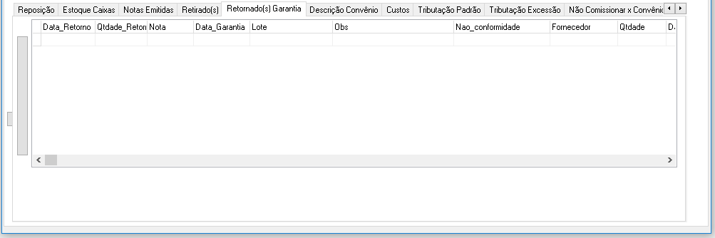 - Campo de Visualização: Data_Retorno, Qtidade_Retorno, Nota, Data_Garantia, Lote, Obs, Nao_conformidade, Fornecedor, Qtidade, Data, Usuario, Id.