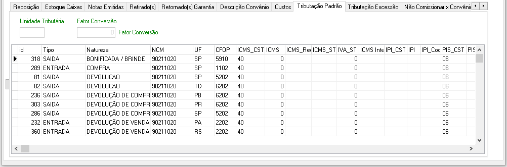 - Campo de Visualização: id, Tipo, Natureza, NCM, UF, CFOP, ICMS_CST, ICMS, ICMS_Red, ICMS_ST, IVA_ST, ICMS Interna, IPI_CST, IPI, IPI_Codigo, PIS_CST, PIS, COFINS_CST, COFINS, IRR, Obs, Dados_Adicionais.