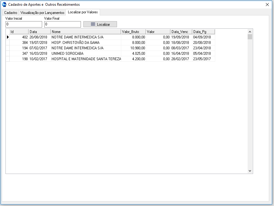 Guia Localizar por Valores: Caso queira procurar um aportes por valor é só indicar um valor inicial e final e clicar em Localizar.