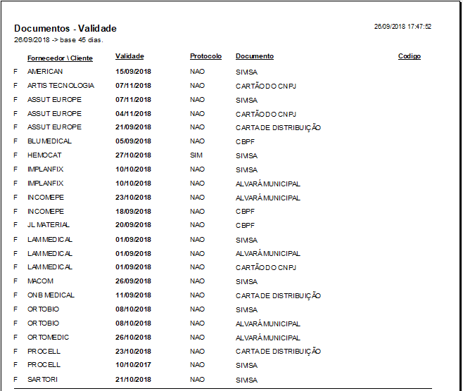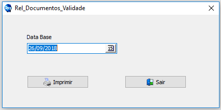 Ao abrir a guia do Relatório irá aparecer essa telinha para indicar uma data que deseja visualizar o Documento e para gerar o Preview é só clicar em Imprimir. O relatório estará listado o nome do Fornecedor ou Cliente, Validade do Documento, Protocolo, Descrição e o Código.
