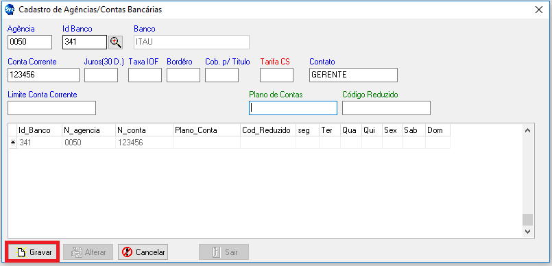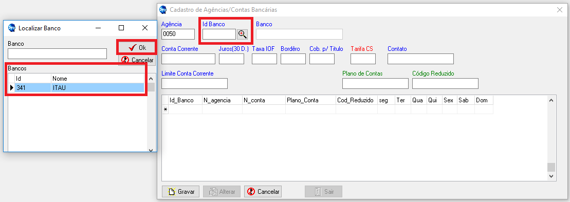 Id Banco: Ao clicar na lupa ao lado da Id Banco, irá listar os bancos cadastrados anteriormente.