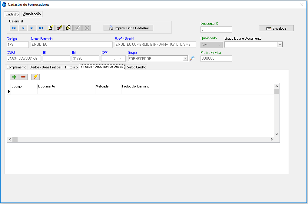 - Aba Anexos - Documentos Dossiê: Guia para anexos de documentos que sejam pertinentes a esse fornecedor, por exemplo, Alvará Municipal, Carta de distribuição, Certificado de Responsabilidade Técnica, Autorização de Funcionamento Anvisa entre outros.