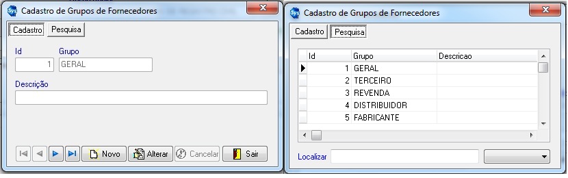 Exemplo: No caso do campo Grupo. Abre tela de cadastro do Grupo. Lembrando que para inserir novo grupo só clicar no botão Novo. Caso queira mudar grupo já existente só clicar alterar. Tanto ao inserir ou editar campo sempre clica no botão salvar para finalizar operação com sucesso.