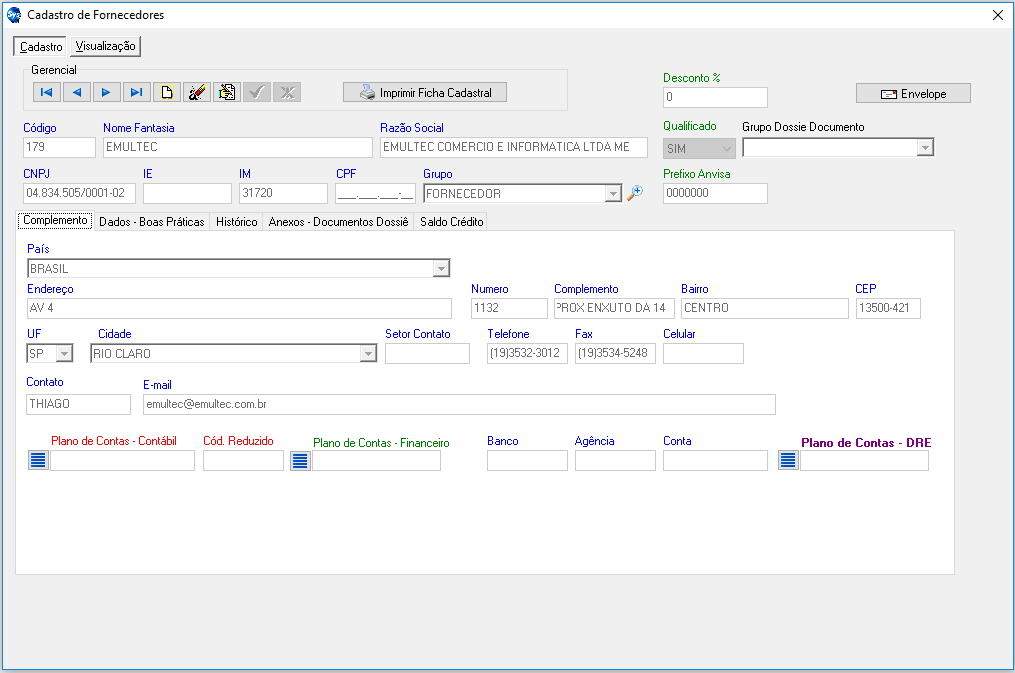 - FAX: assim como no campo telefone, fica a seu critério informar um FAX para o fornecedor.