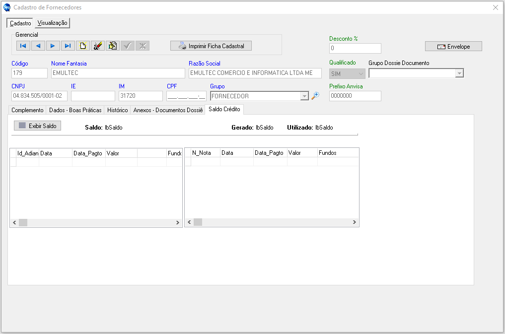 - Aba Saldo Crédito: Essa guia serve para os fornecedores que preferem deixar uma quantia com a empresa e depois ir abatendo com as vendas.