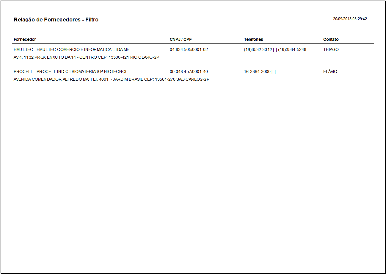 - Endereço: endereço do fornecedor.