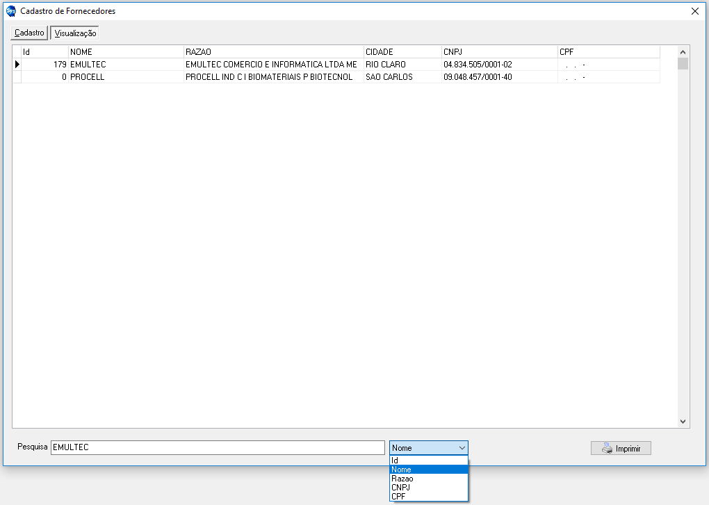 Tela de CADASTRO DE FORNECEDORES: