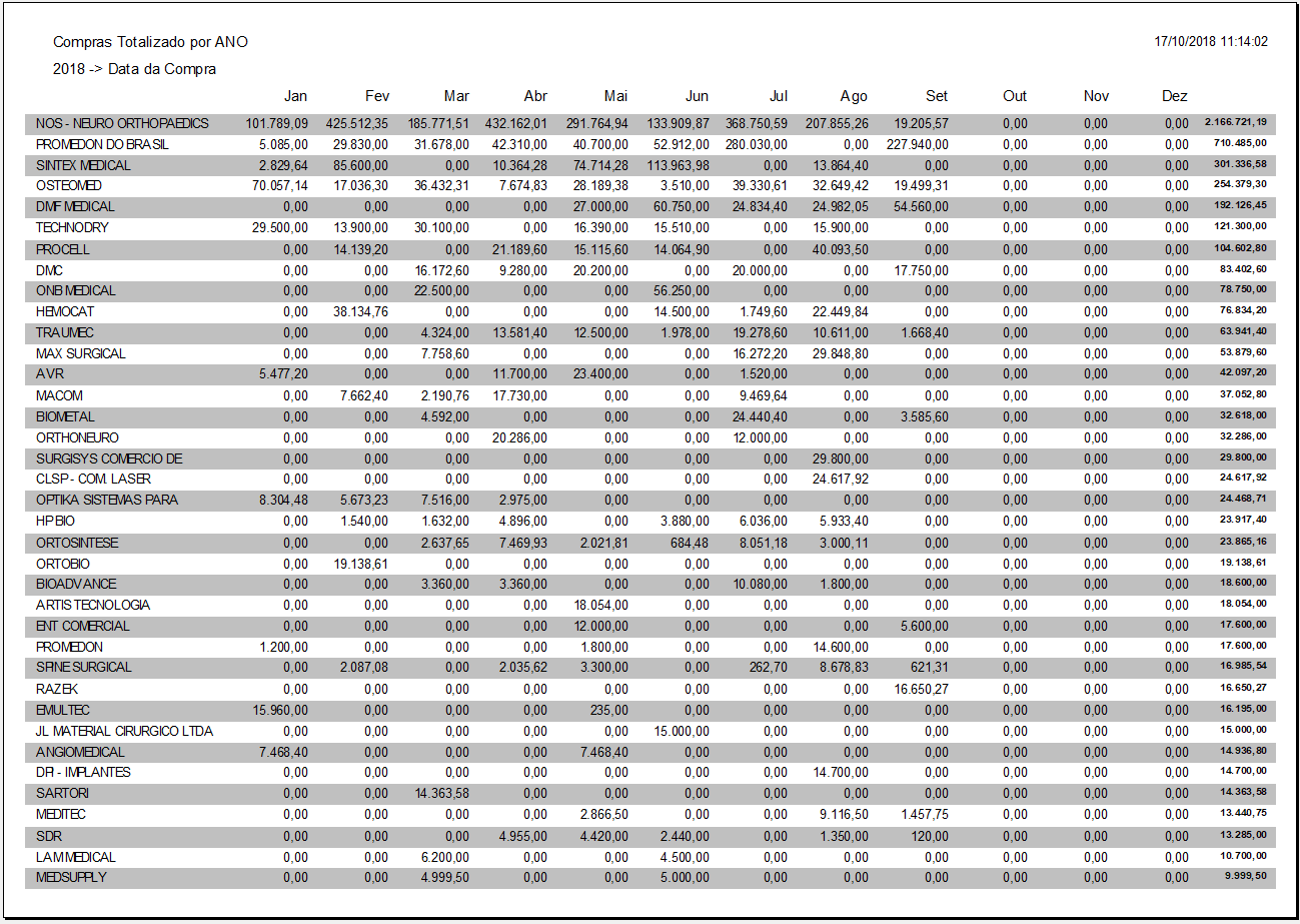 Exemplo de como sairá o relatório, tenho como filtro o Ano de 2018 e a Data da Compra selecionada.