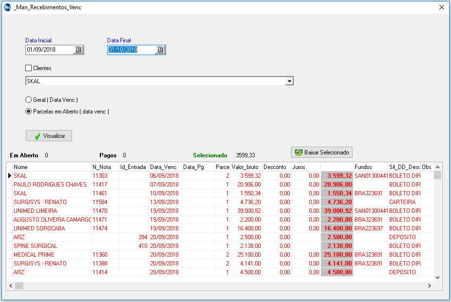 Para filtrar as parcelas recebidas é só indicar uma Data Inicial e Final, caso queira um cliente especifico setar qual seria ele, marcar a opção Parcelas em Aberto e clicar em Visualizar.