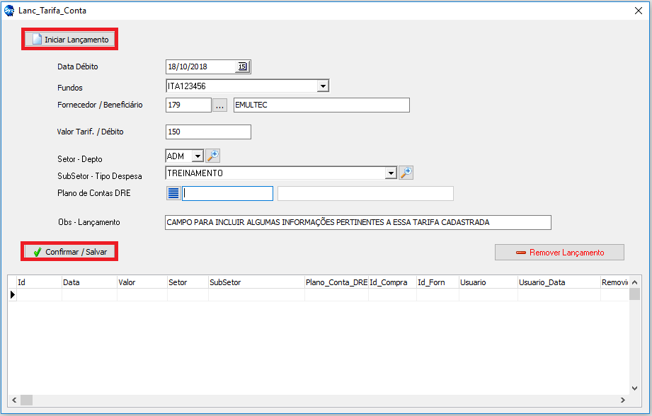 Para efetuar a inclusão de um novo registro, terá de clicar em “Iniciar Lançamento”, preencher os campos como mostra a imagem abaixo e depois para registrar é só clicar em “Confirmar/ Salvar”.