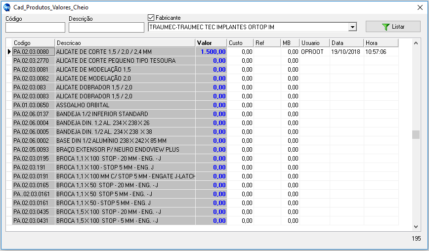 Como filtro, temos o Fornecedor, Código e a Descrição do Material. Após a indicação do Fornecedor, clicar em Listar. Para preencher as informações, deverá clicar duas vezes no campo e escrever as informações. Ao salvar, o sistema irá preencher os campos Usuário, Data e a Hora.