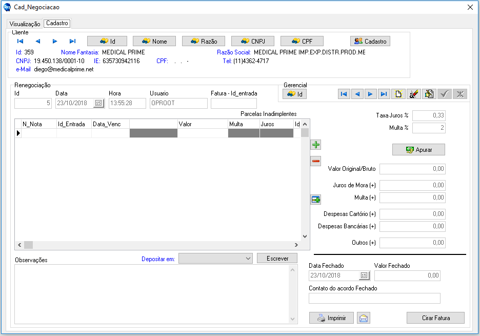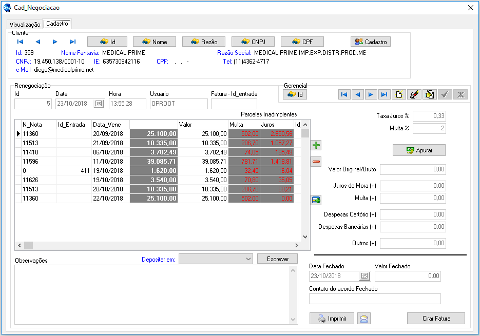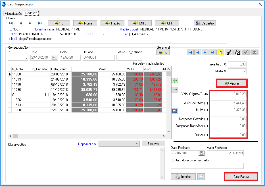 Clicar no botão Apurar que será recalculado os valores com as multas. Ao terminar de preencher as informações, clicar em Criar Fatura.
