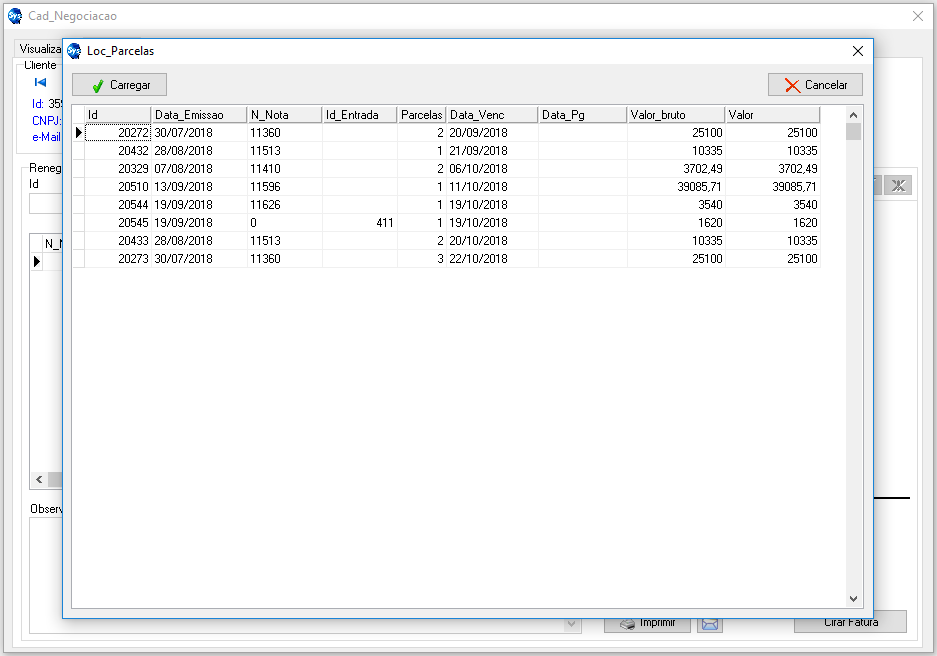 Ao selecionar as parcelas desejadas, ficará listadas como na imagem abaixo. Por padrão irá puxar a taxa e a multa, conforme as informações passada anteriormente para o cadastro.