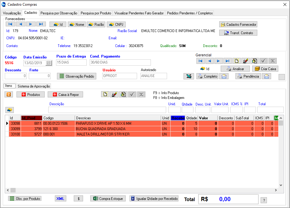 Guia Cadastro: Tela onde será incluída as ordens de compras ou pedidos de compras.
