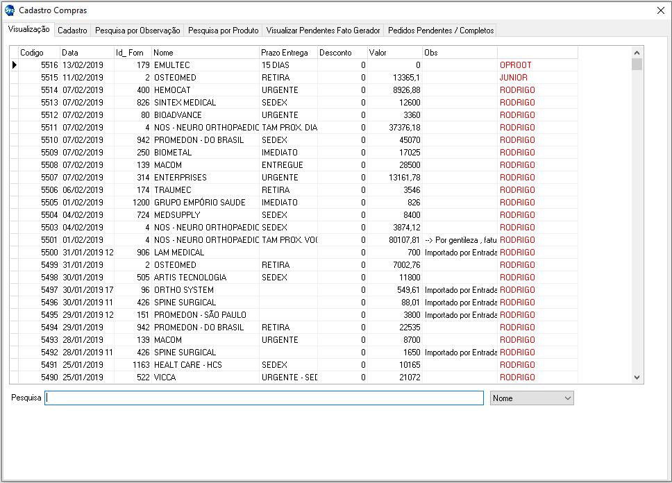 Guia Visualização: Aba onde consta todas as compras que foram feitas as entradas, tanto por XML ou manual. A busca pode ser feita pelo nome do Fornecedor ou pelo Código da Ordem de Compra.