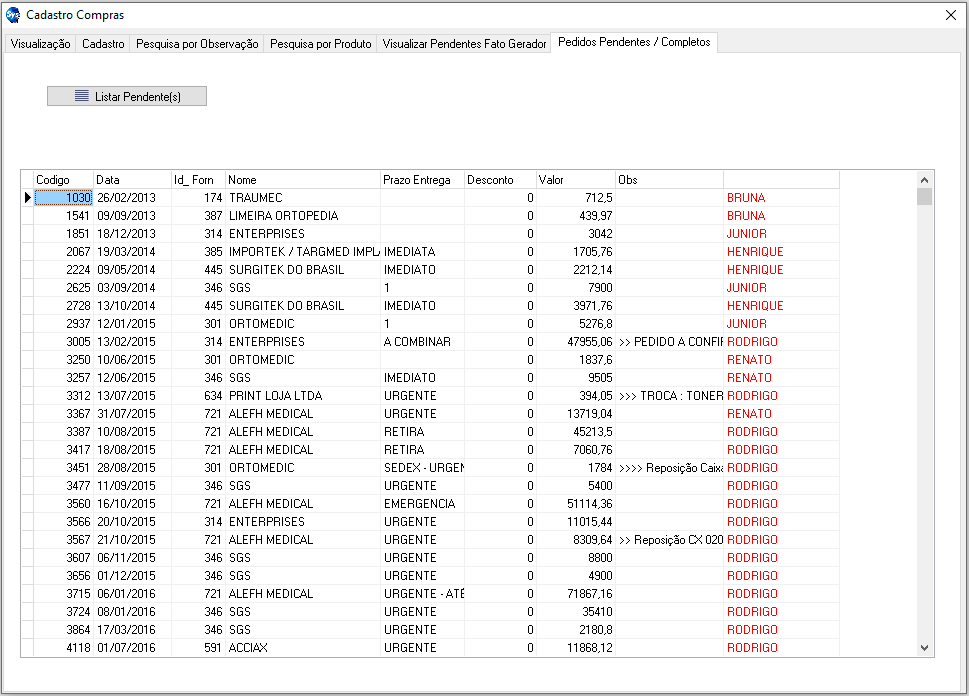 Guia Pedidos Pendentes/ Completos: Essa telinha tem como objetivo listar os produtos com pendências de entrada. Para verificar é só clicar no botão Listar Pendente(s). Que será listado no grid abaixo.