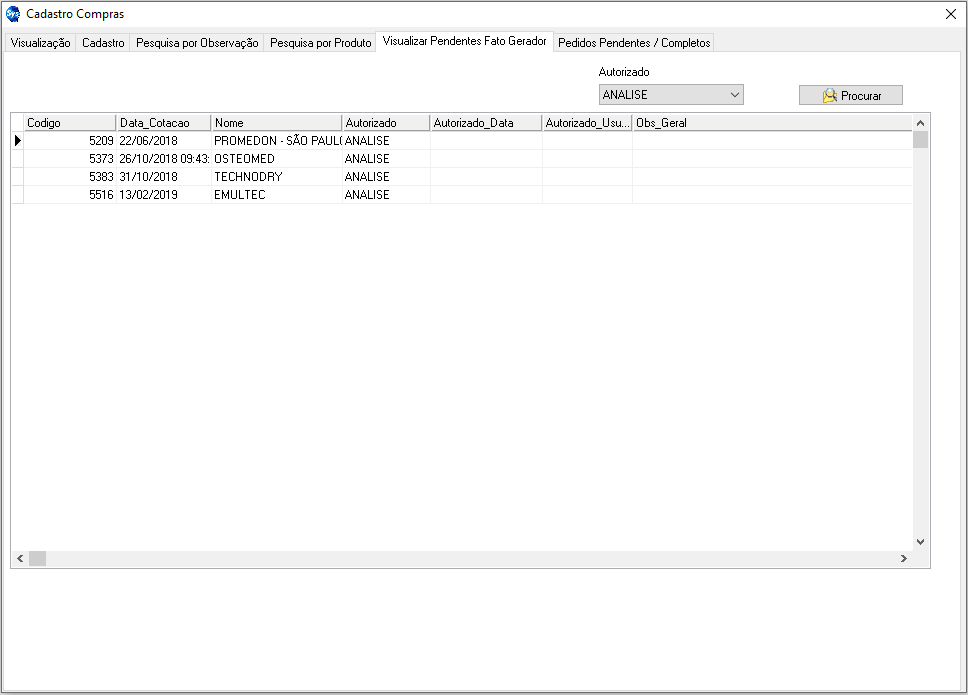Guia Visualizar Pendentes Fato Gerador: Tela onde ficará listado os pedidos de compra com status ANÁLISE, REPROVADO E SIM. Ao escolher a opção, clicar em Procurar que o mesmo será listado.