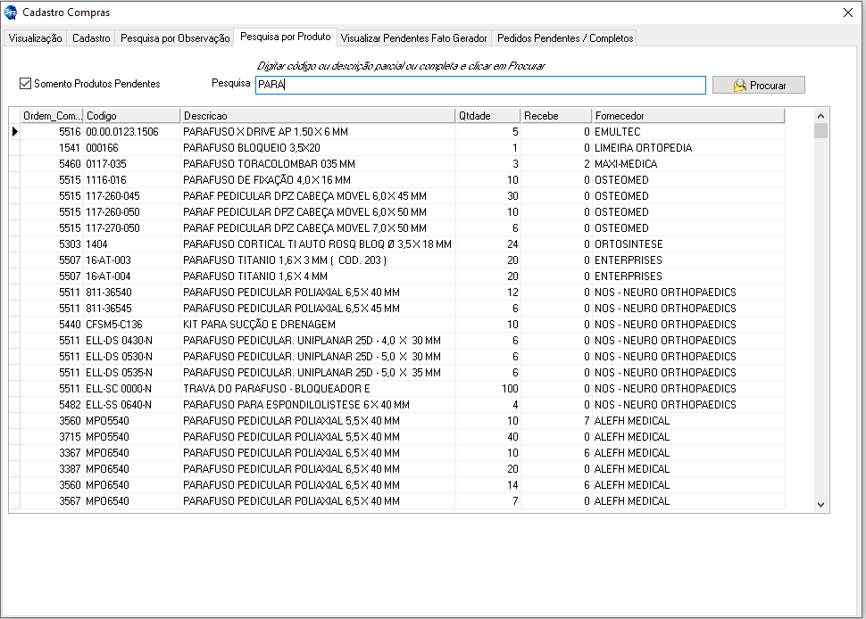 Guia Pesquisa por Produto: Telinha de busca para os produtos que constam como pendentes ou não. Ao digitar o produto, clicar em Procurar, que o mesmo será listado no grid abaixo.