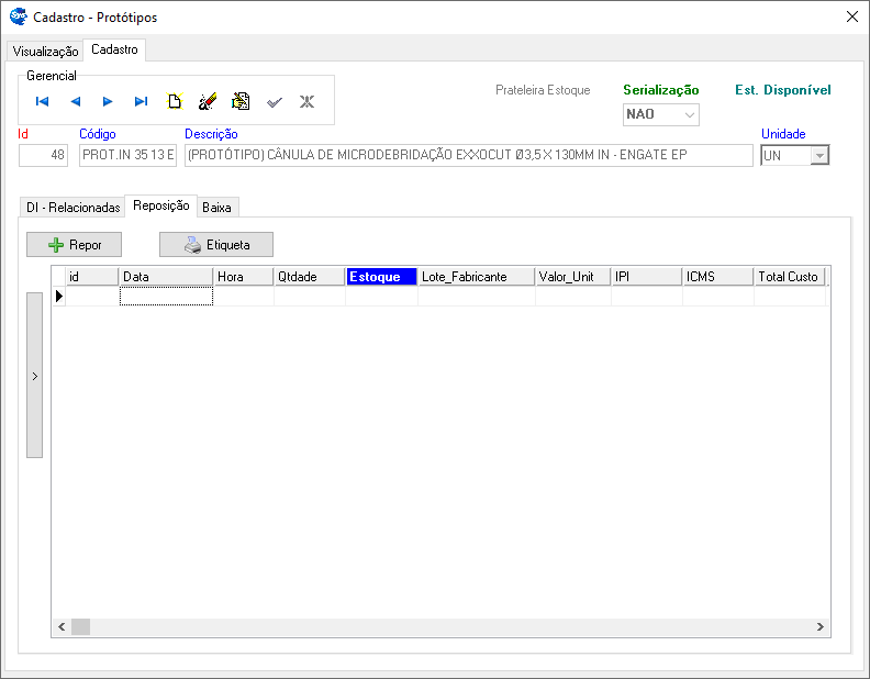 Aba de reposição: Contém as entradas dos itens e saldos.