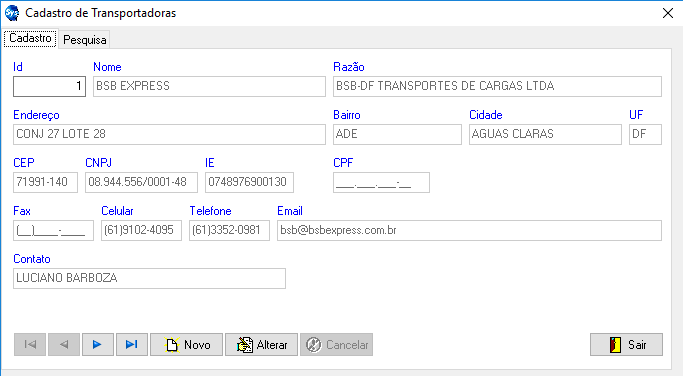 Aba Cadastro: Tela de inclusão de novas transportadoras.