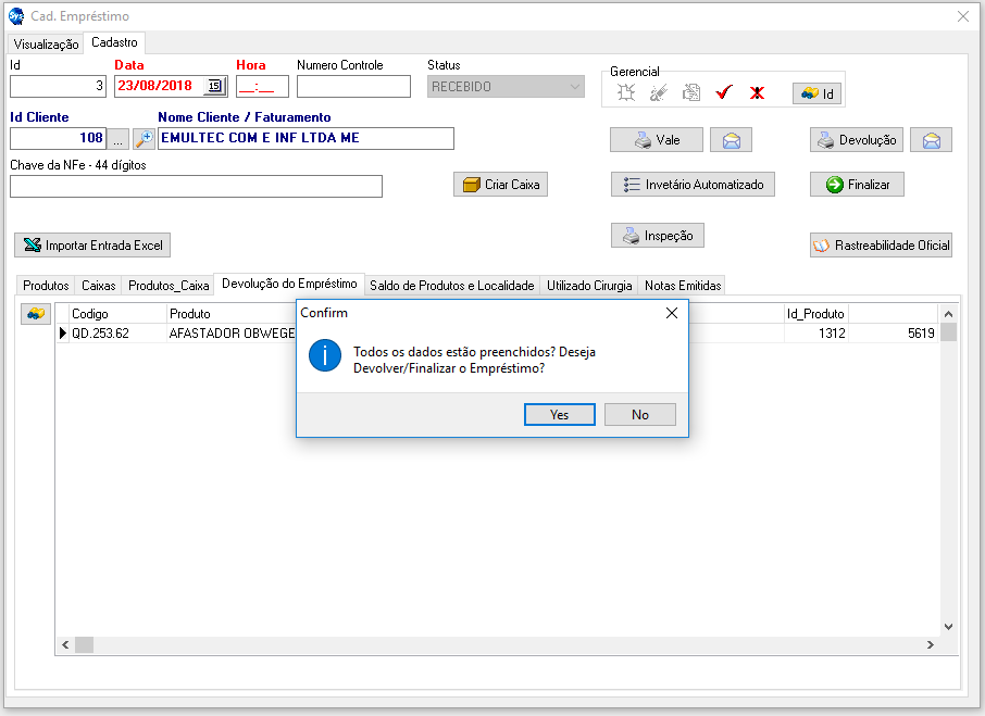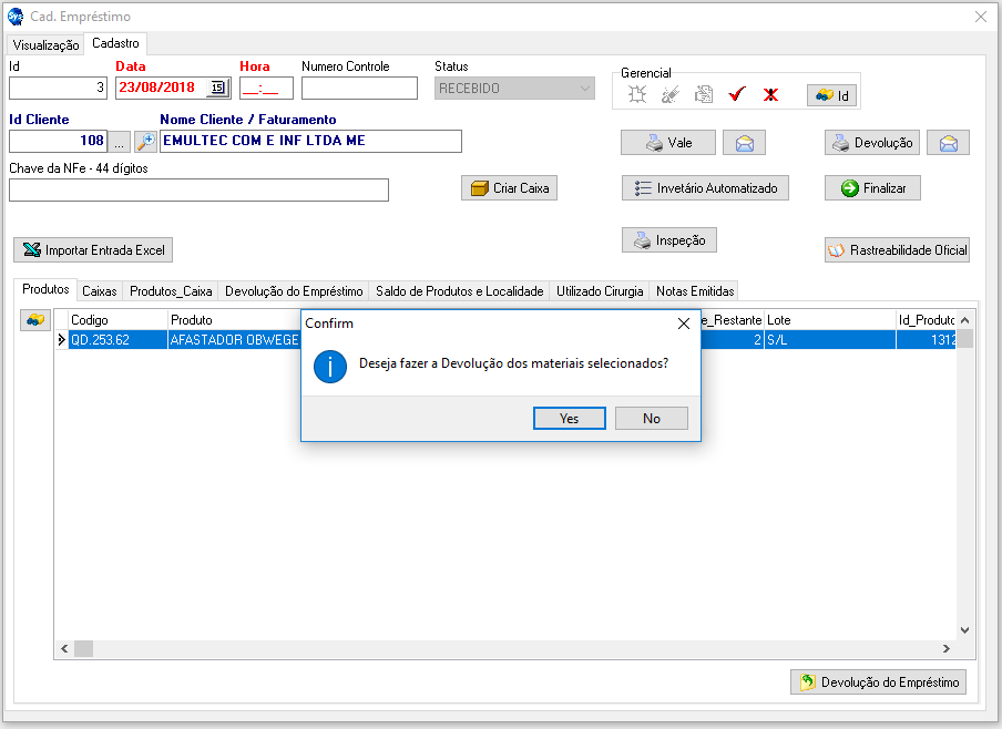 Na aba "Produtos" selecione o produto que deseja devolver, em seguida clique no botão "Devolução do Empréstimo", e aparecerá a seguinte mensagem:
