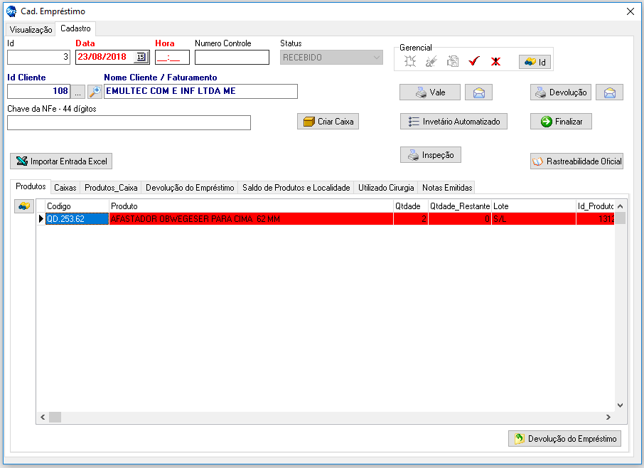 Note que, se clicar na aba Devolução do Empréstimo, os produtos estarão listados nessa aba.