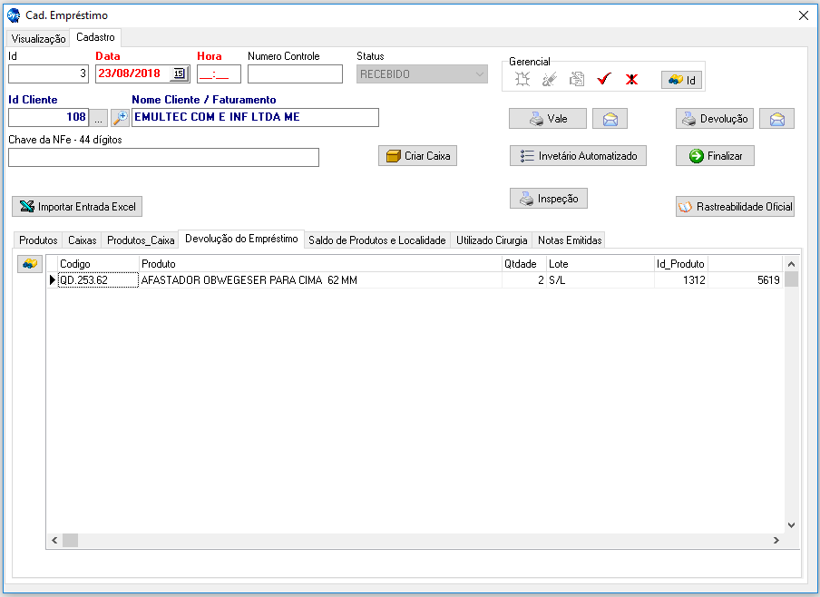 - Status: Pode variar entre recebido e devolvido. Para que o status mude é importante ser finalizado o processo.