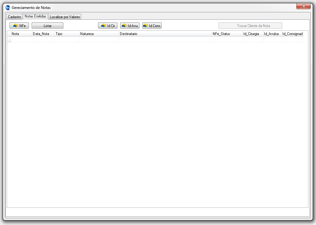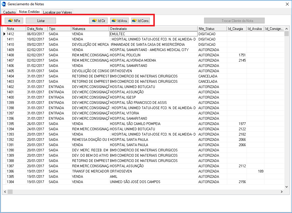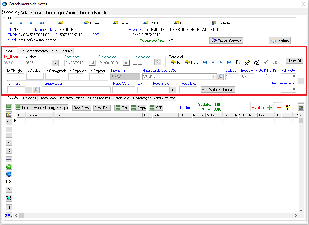 Botão "Transf. Contrato": permite que a nota seja feita em um cliente e transferida a outro antes da emissão.