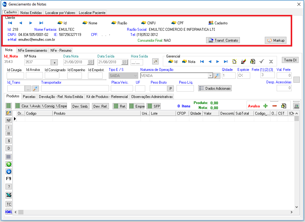 Primeiro procedimento ao emitir uma Nota, seria indicar o Cliente para o Faturamento. Localizando o mesmo pelo seu ID, Nome, Razão Social, CNPJ e CPF. Tendo a possibilidade de efetuar o Cadastro no momento da emissão da Nota.