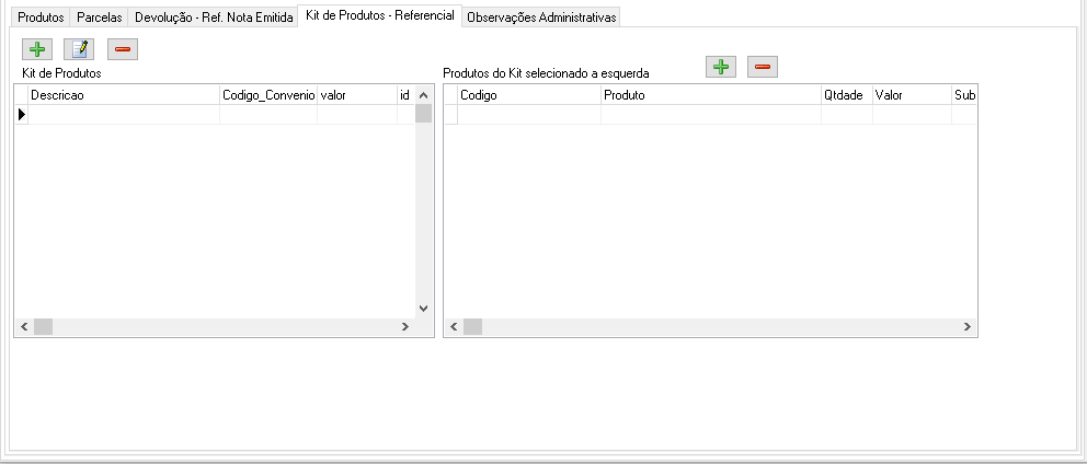 Botão "-": remover produto selecionado do kit existente.Aba de Observações Administrativas