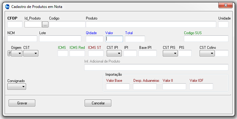 Tela de cadastro de produtos inseridos manualmente. Preencher todos os campos abaixo de forma correta.