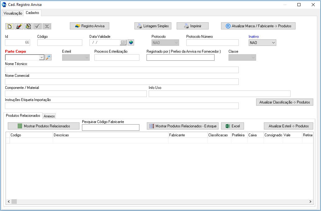 - Botão Registro Anvisa: localizar registro Anvisa já cadastrado de maneira rápida.