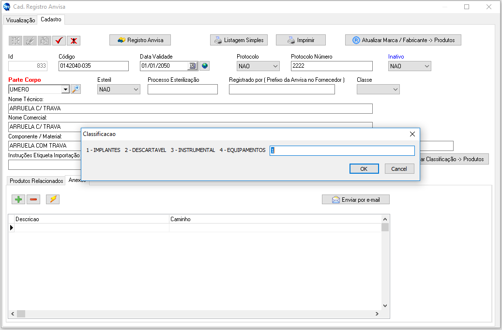 - Botao Atualizar Classificação -> Produtos: Esse botão tem como finalidade, efetuar a alteração da classificação do material. Alterando para Implantes, Descartável, Instrumental ou Equipamentos.