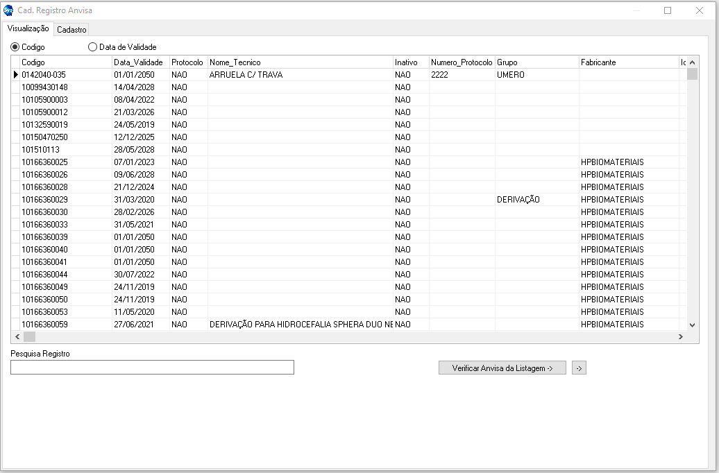 - Aba de Visualização: Tela de exibição dos Registros Cadastrados. A opção de busca é feita em cima do Código do Registro, podendo ser listado pela Validade ou Código.