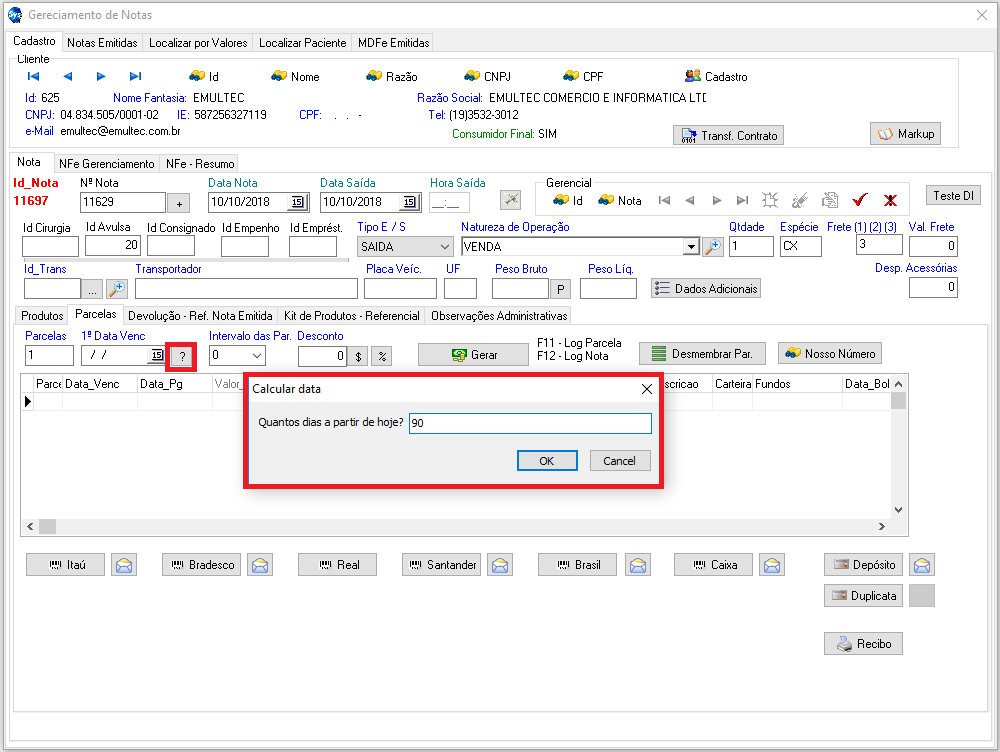 onde pode informar a quantidade de dias à partir da data atual, o sistema cálcula qual a primeira data de vencimento), feito isso, selecione o periodo de intervalo entre uma parcela e outra (0, 5, 10, 15, 20, 25, 30 dias). Depois de informado como sera a parcela, salva a nota fiscal selecionando o botão