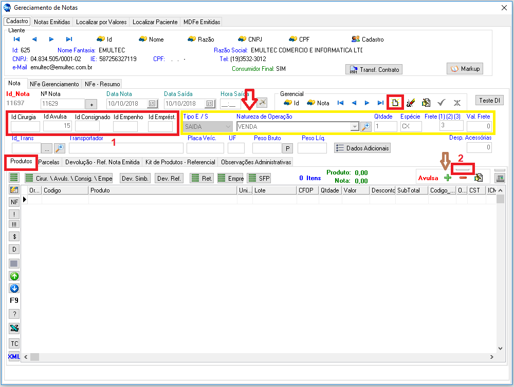 para que o sistema vincule os produtos utilizados no id informado em um dos campos, para a nota fiscal. Se por acaso essa venda seja feita direta sem ser pelo avulso, pode-se adicionar produtos através do botão