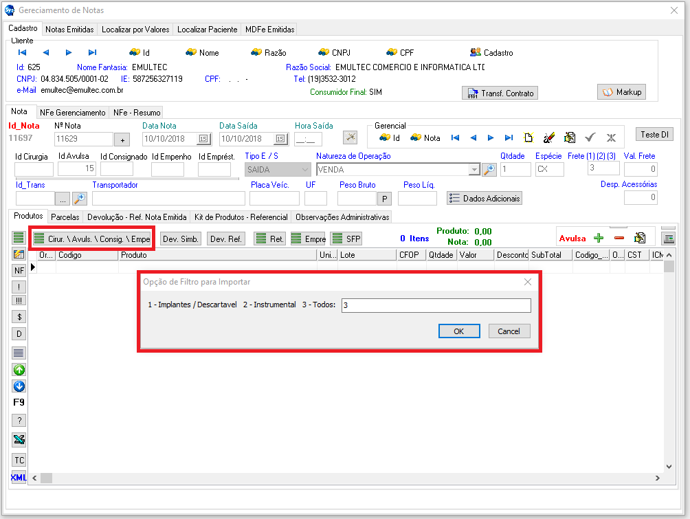 ao lado do campo Nº NOTA. Feito isso, o sistema irá gerar uma nova sequencial para a emissão dessa Nota Fiscal. Esta Nota Fiscal de Venda pode ser feita através de uma cirurgia, pode também através de uma venda avulsa (venda direta) ou também por consignado. Para isso, conforme à saída dessa venda, qual foi o tipo de saída desse material, colocando o "ID" do tipo do material que saiu, ou seja, se for cirurgia indicar o "id" da mesma no campo ID CIRURGIA, se for venda avulsa indicar o "id" dela no campo ID AVULSA. Se for produto de empréstimo, informe seu id no campo ID EMPRESTIMO para importar os produtos. Depois de informado o tipo de venda, se por acaso foi alguma delas citadas acima, selecione o botão
