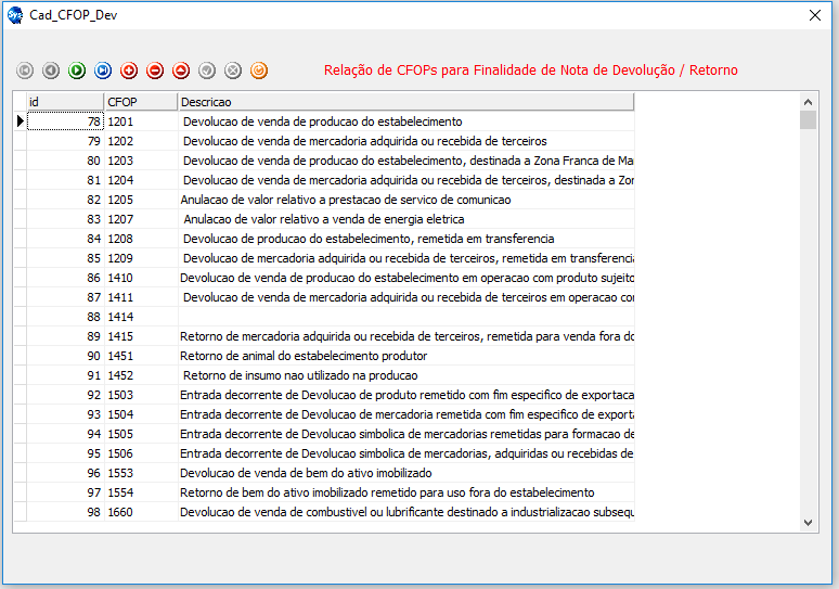 Essa tela tem como finalidade, efetuar o cadastro de CFOP's de Devolução e Retorno. Para incluir um novo registro é só clicar no sinal de + (vermelho) e depois clicar em salvar um V (vermelho).