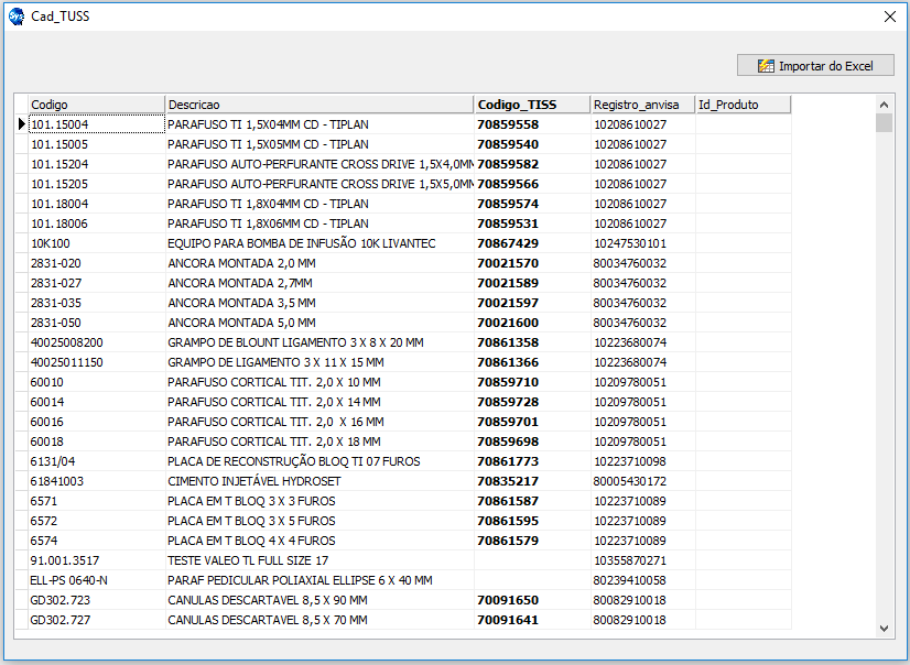 Tela de exibição das tabelas cadastrados no sistema, mostrando como destaque o Código, Descrição, Código_TISS, Registro_Anvisa e o ID_Produto.