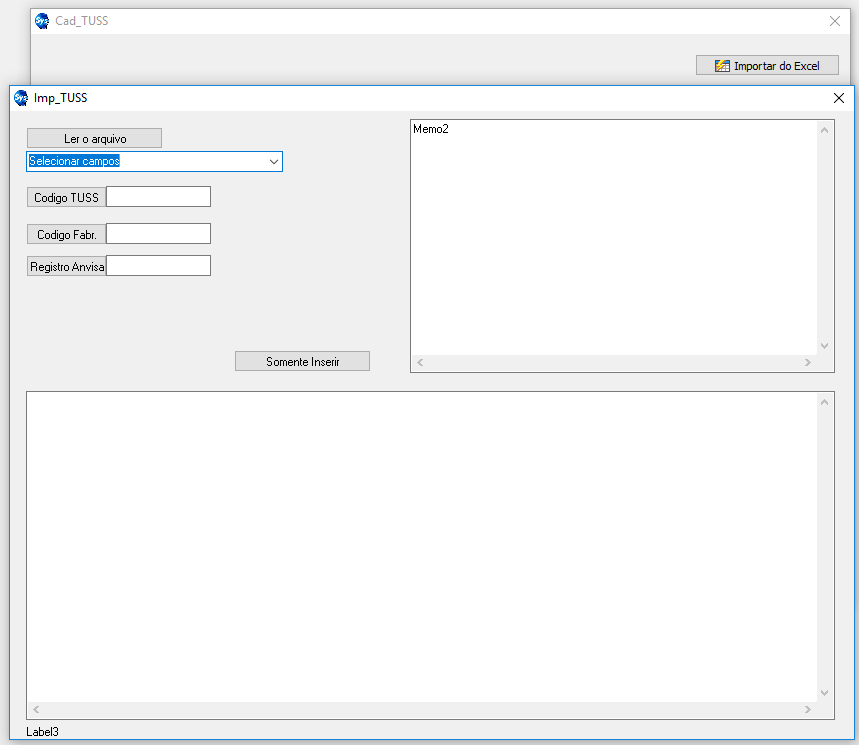 irá aparecer a tela indicada abaixo. Onde será importada as informações da planilha Excel. Tais como, Código TUSS, Código Fabricante e o Registro Anvisa.